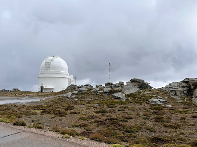 A pesar de que Almería "tiene fama de casi desierto", en esas fechas del 2 al 5 de Junio, en Calar Alto, tuvimos de todo: algo de sol, niebla, lluvia, tormenta, nubes y humedad....Todo en el mismo día, y casi en cuestión de minutos. De hecho tuvimos que retrasar el comienzo de las observaciones, justamente por la altísima humedad (por encima del 97 %) que había por la noche. En esas condiciones, ningún telescopio podía observar, de modo que había que esperar hasta que fuera menor (sorprendentemente) del 95 %, que es el "tope" con el que "está permitido" abrir las cúpulas.
